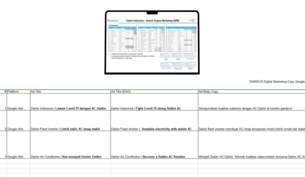I was the Ads Copywriter for Daikin Indonesia. I made three kind of Ads Copywriting for each of Facebook Ads, Instagram Ads, and Google Search Ads.